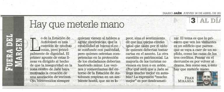 16/04/2026 Artículo sobre necesidad de actuación Diario Jaén de 16/04/2026